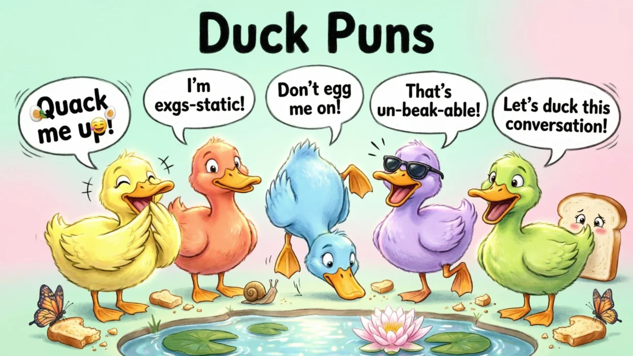 Dive into these hilarious duck puns that are guaranteed to bring a smile to your face and get everyone around you laughing out loud. Perfect for sharing at parties or online, these clever wordplays twist everyday phrases into duck-themed fun, drawing from classic humor sources to keep things light-hearted and entertaining.